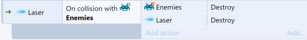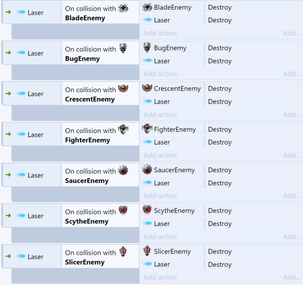 The Families example in Construct demonstrates the advantage of this. At that place are vii kinds of enemy, and they all need to be destroyed when the light amplification by stimulated emission of radiation hits them. Without families, seven divide events are necessary, as shown below: